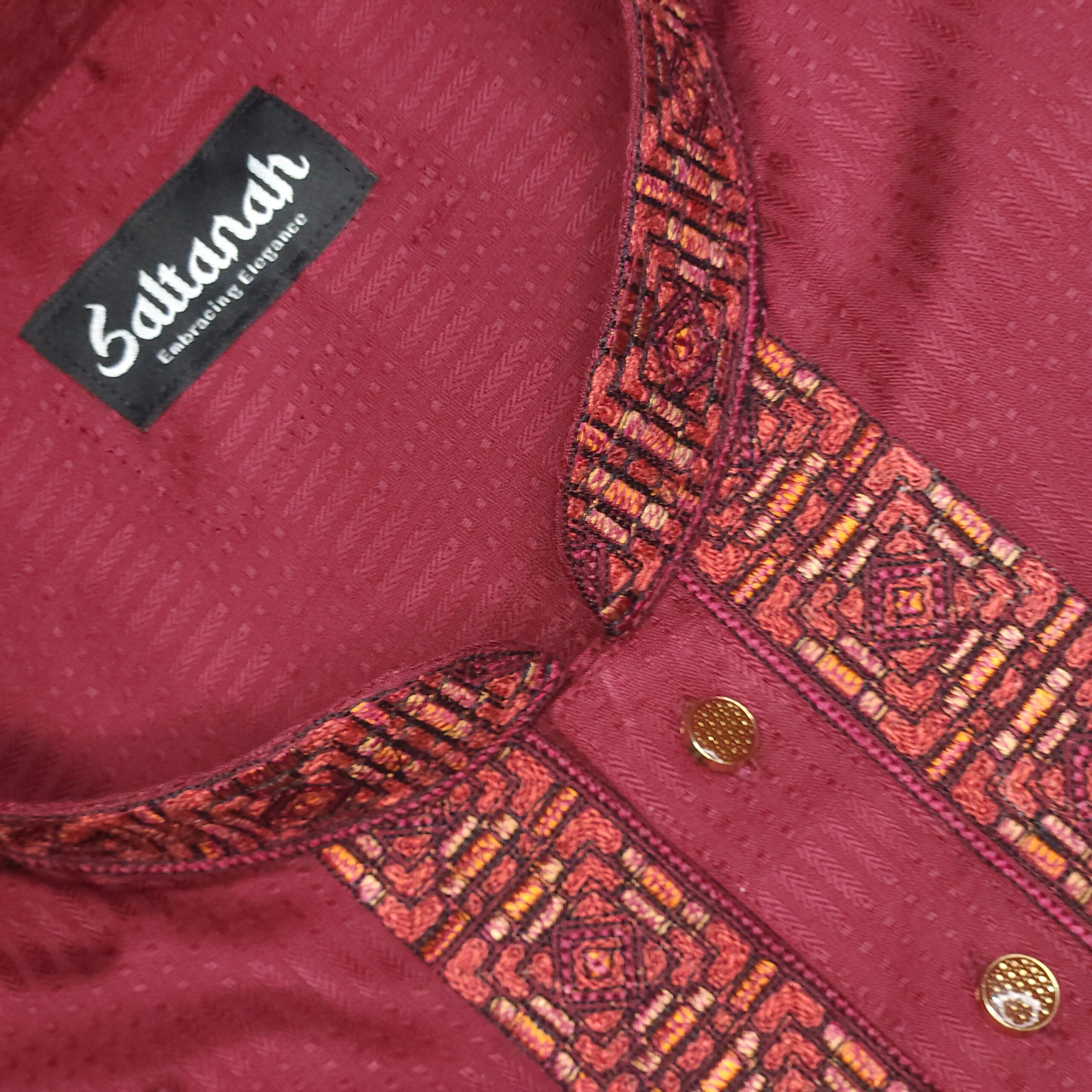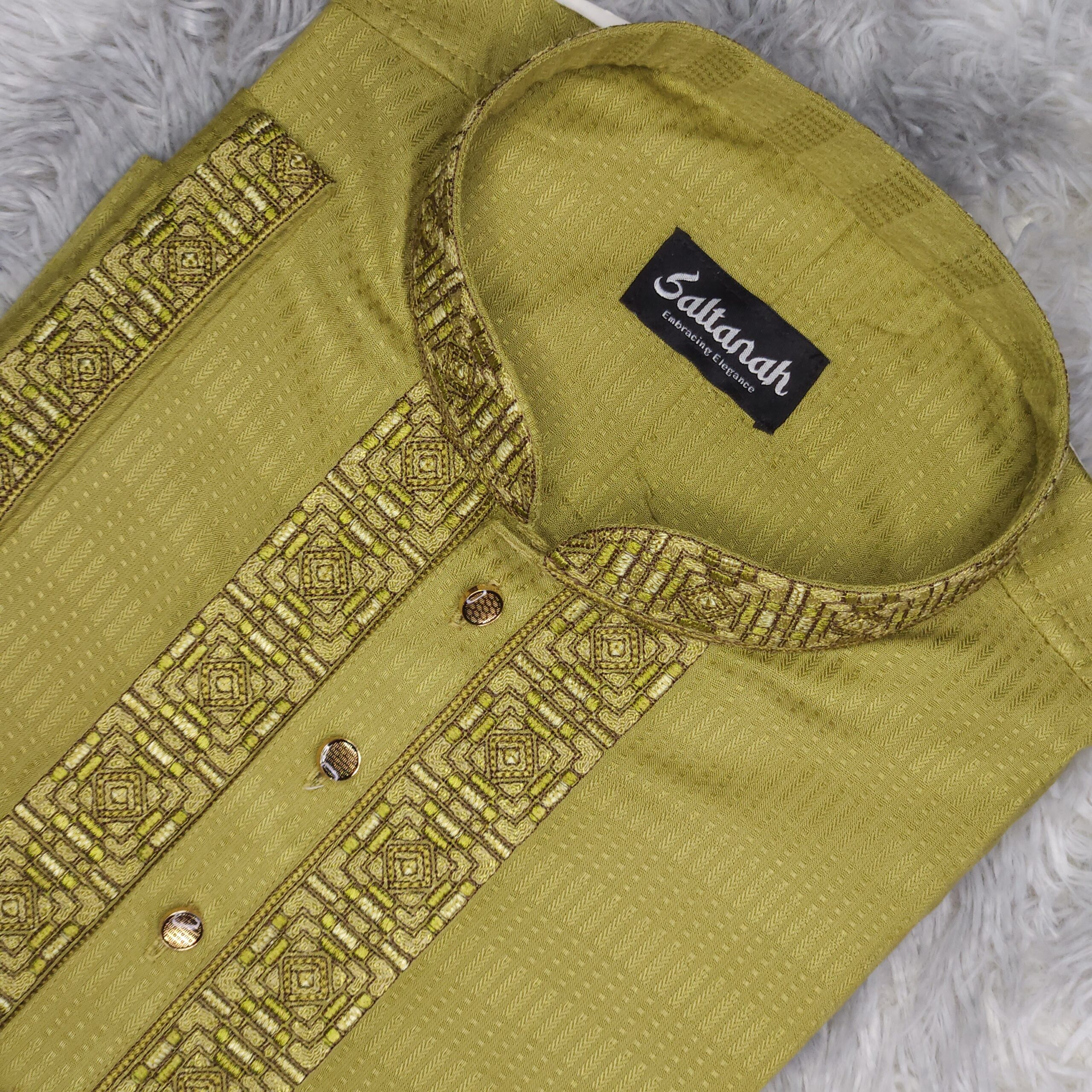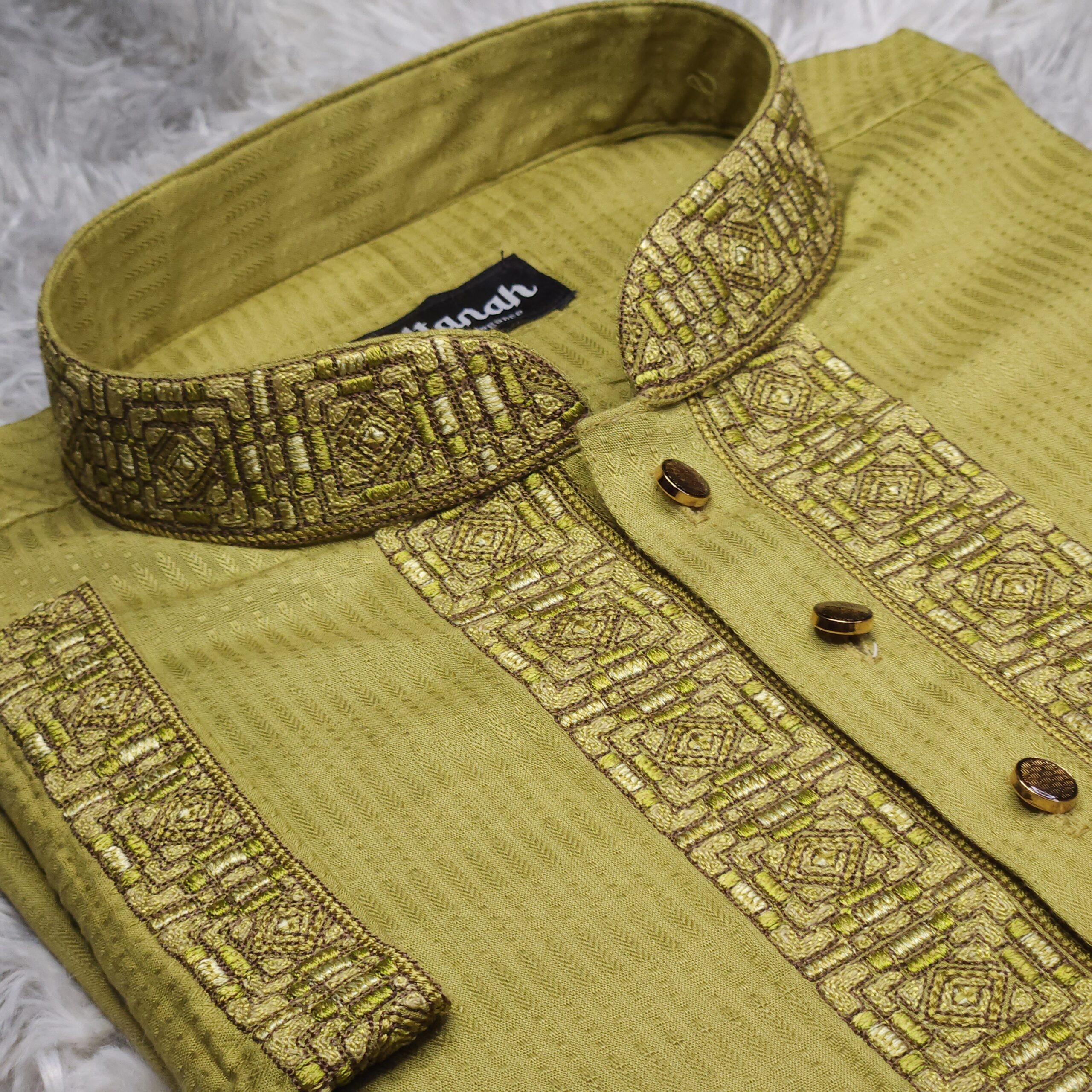 This garment appears to be made from a Handloom Cotton or Dobby-textured Viscose-Cotton blend. These materials are highly valued in South Asian menswear for being lightweight, breathable, and comfortable for long durations. The embroidery is a geometric jacquard style, featuring repeating diamond and square motifs. The quality is “top notch,” using dense thread work that provides a raised, three-dimensional feel to the collar, placket, and chest.