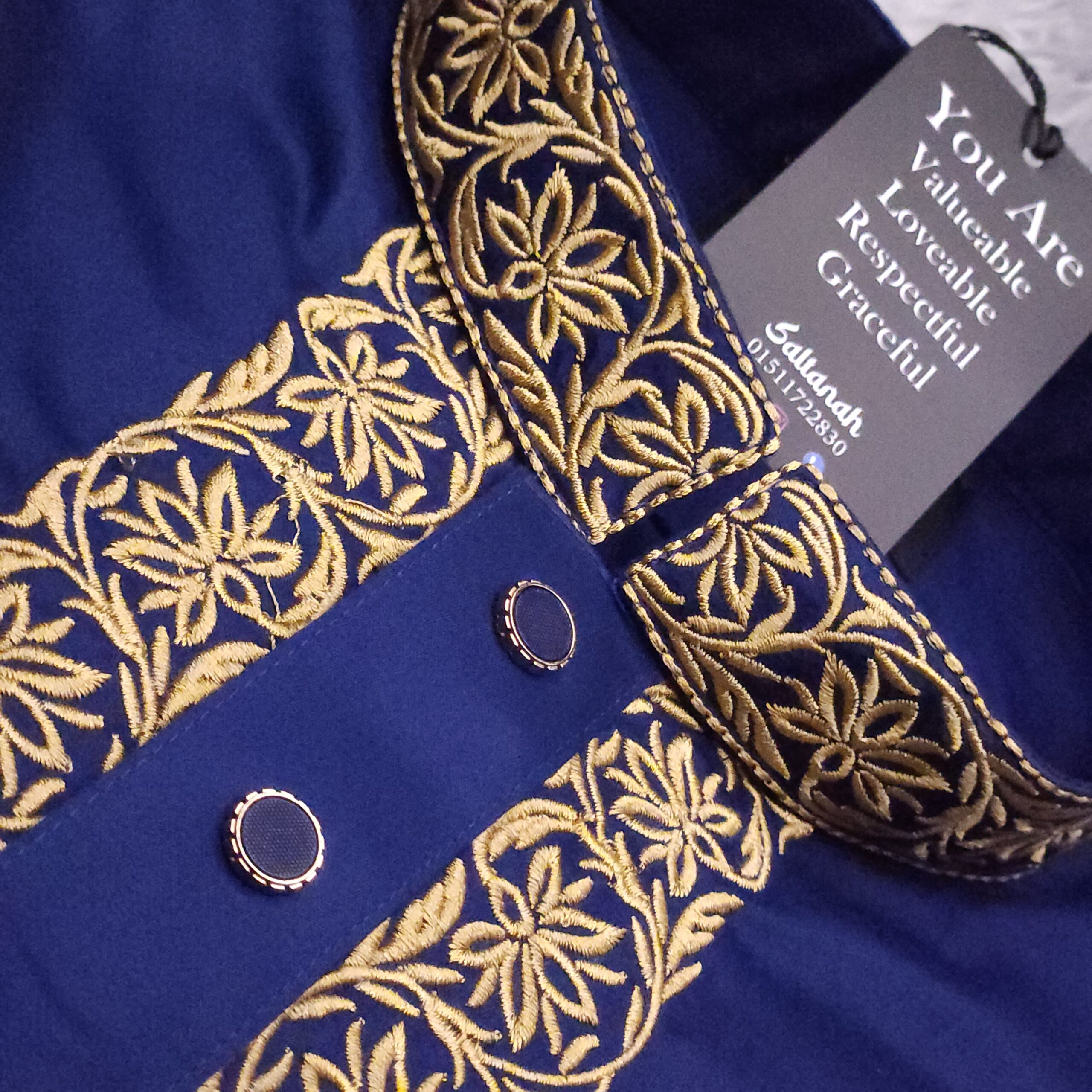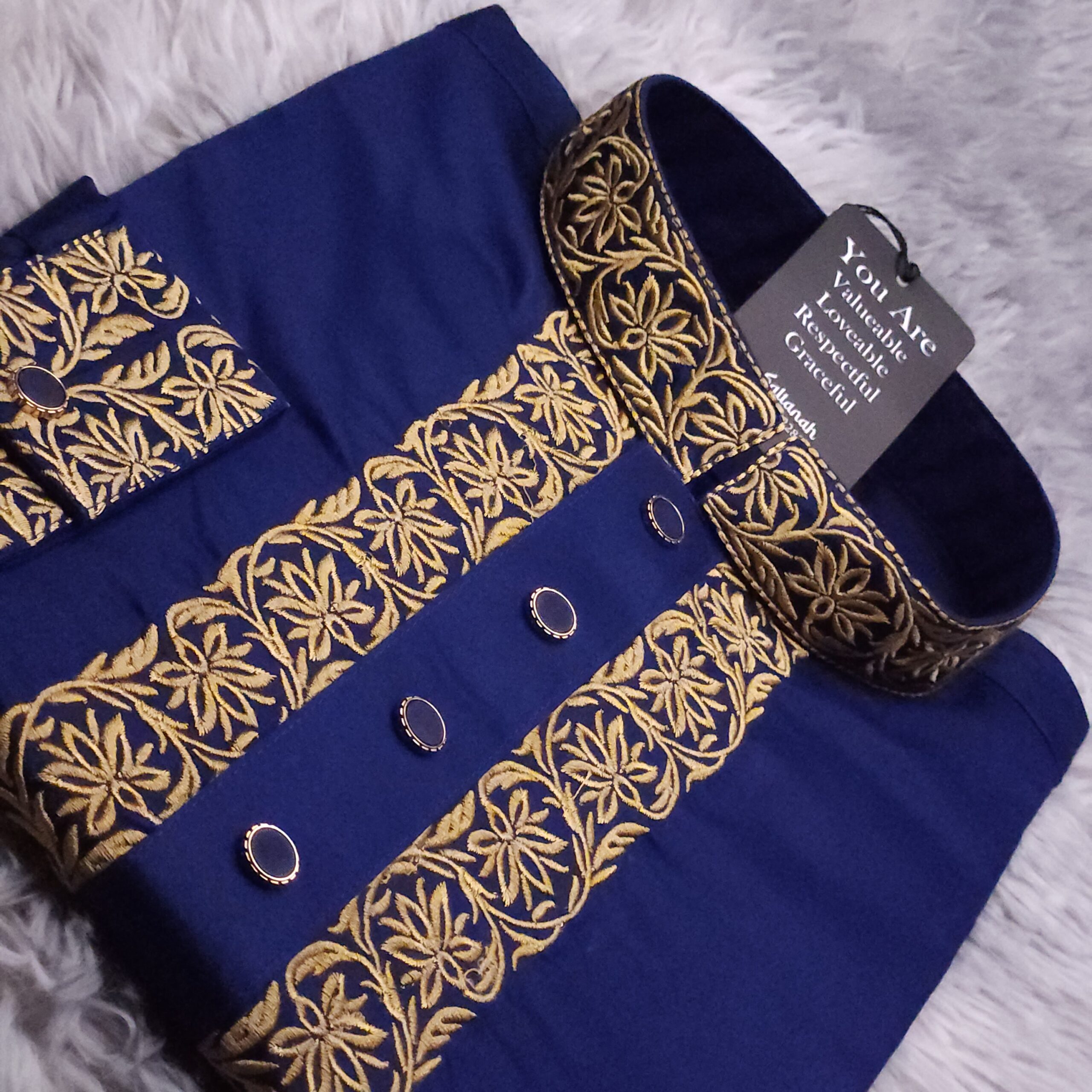 Buttons: It features four prominent, circular buttons. They appear to be dark enamel or stones set in a gold-toned metallic rim, matching the embroidery.
