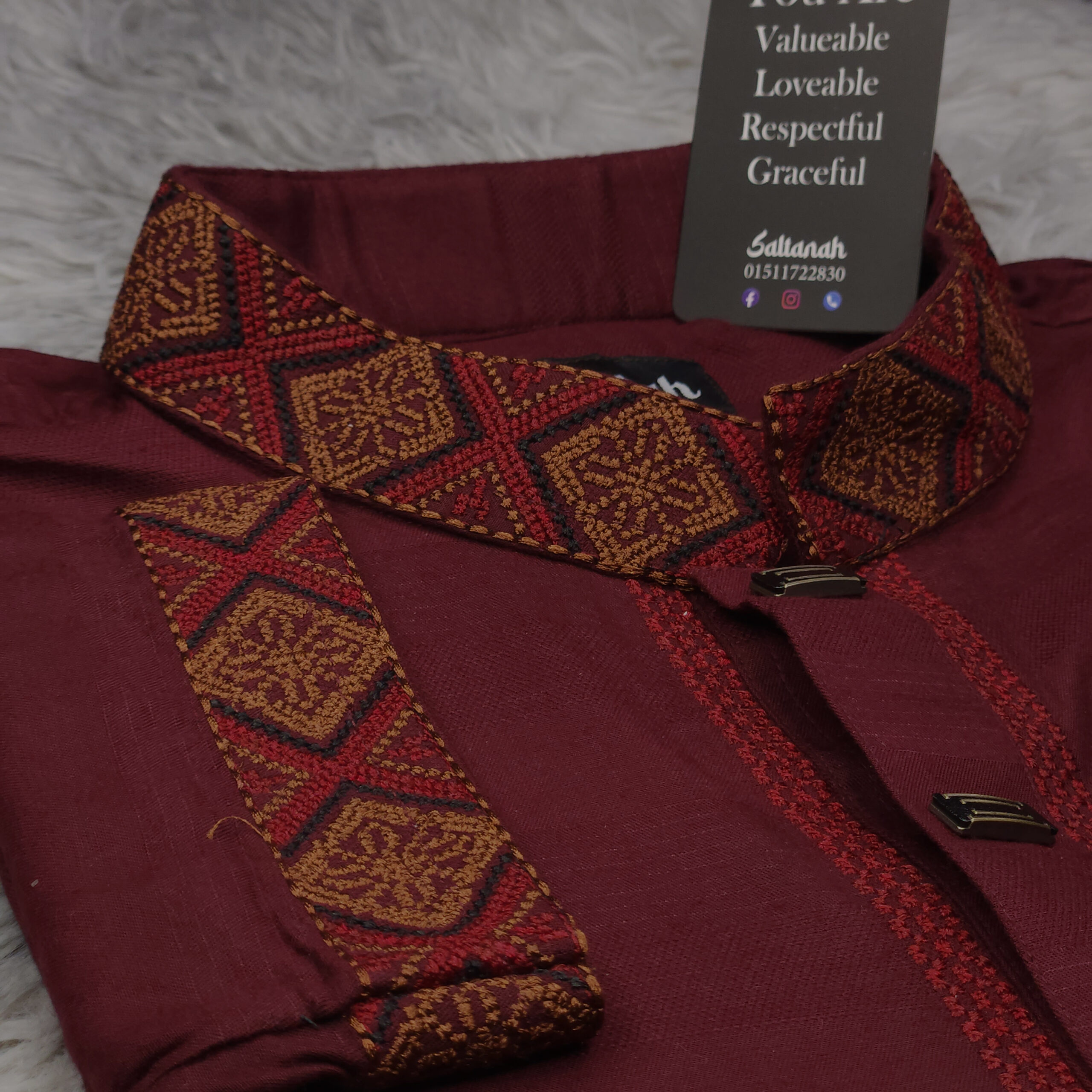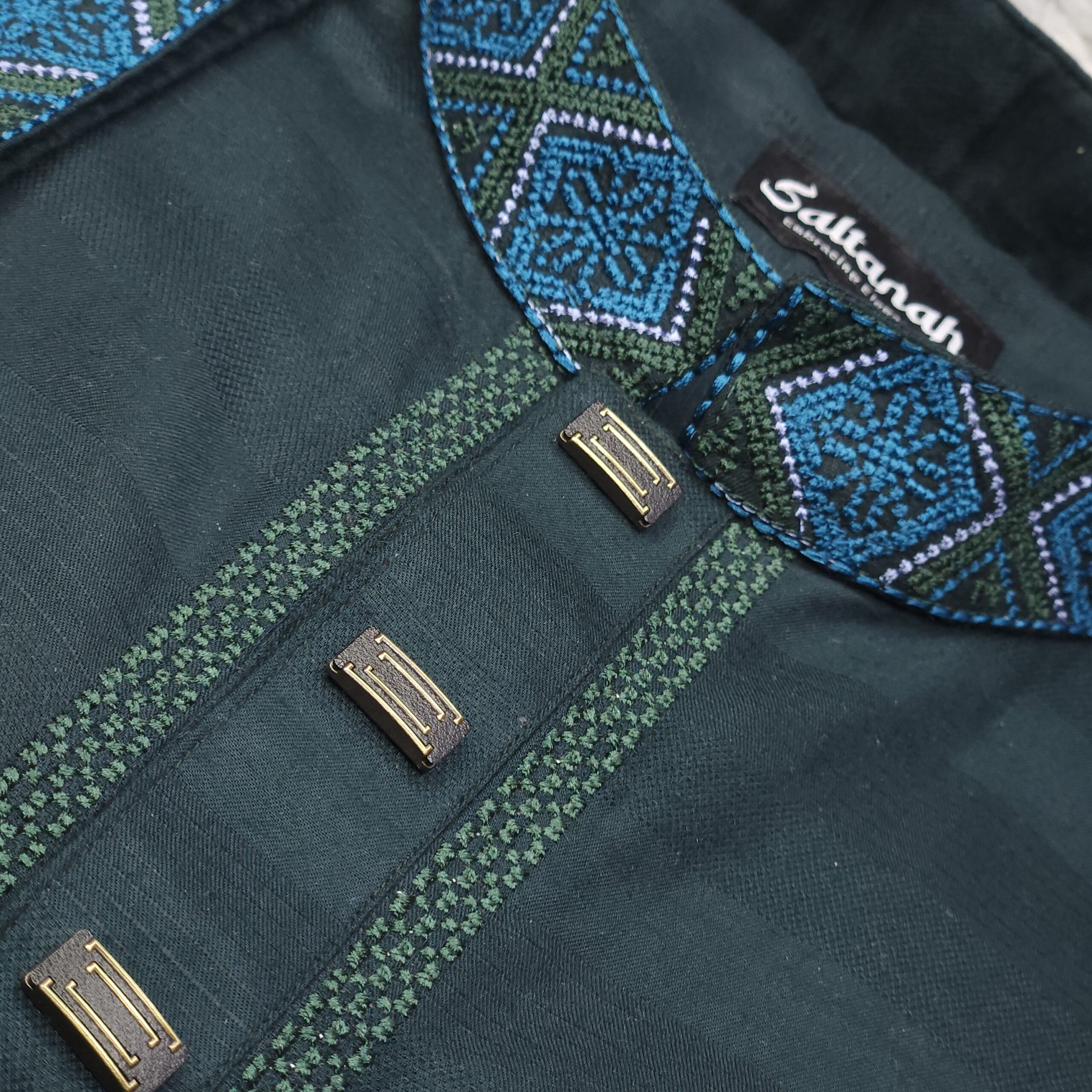 The base fabric features a subtle herringbone or chevron texture, which is much finer than the large jacquard patterns seen on the olive version. This gives the fabric a smoother, more lustrous finish. Unlike the floral patterns of the previous garment, this one uses geometric, tribal-inspired patterns that feel sharper and more structured.