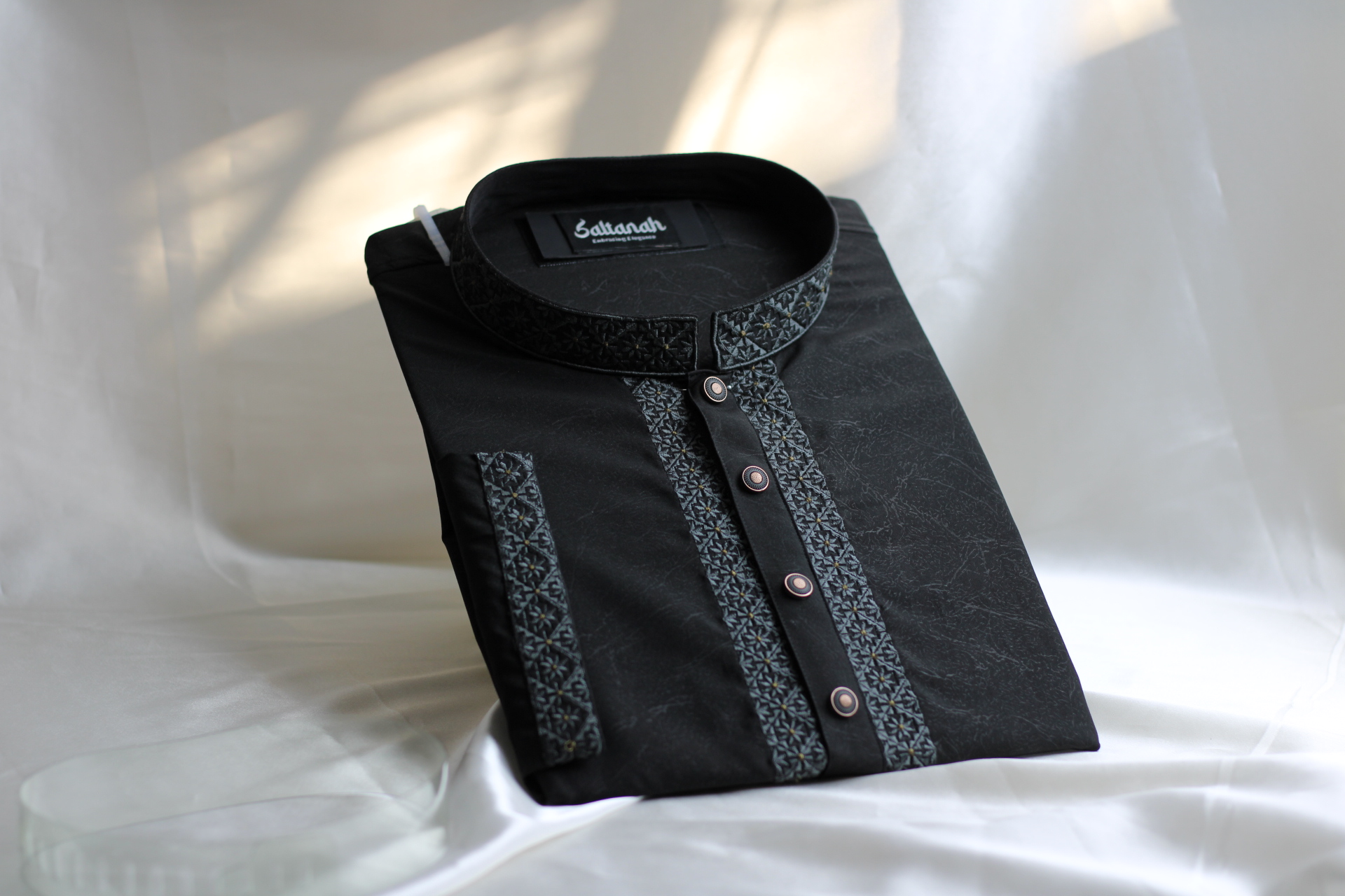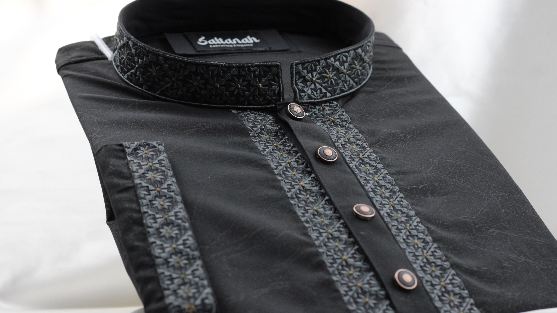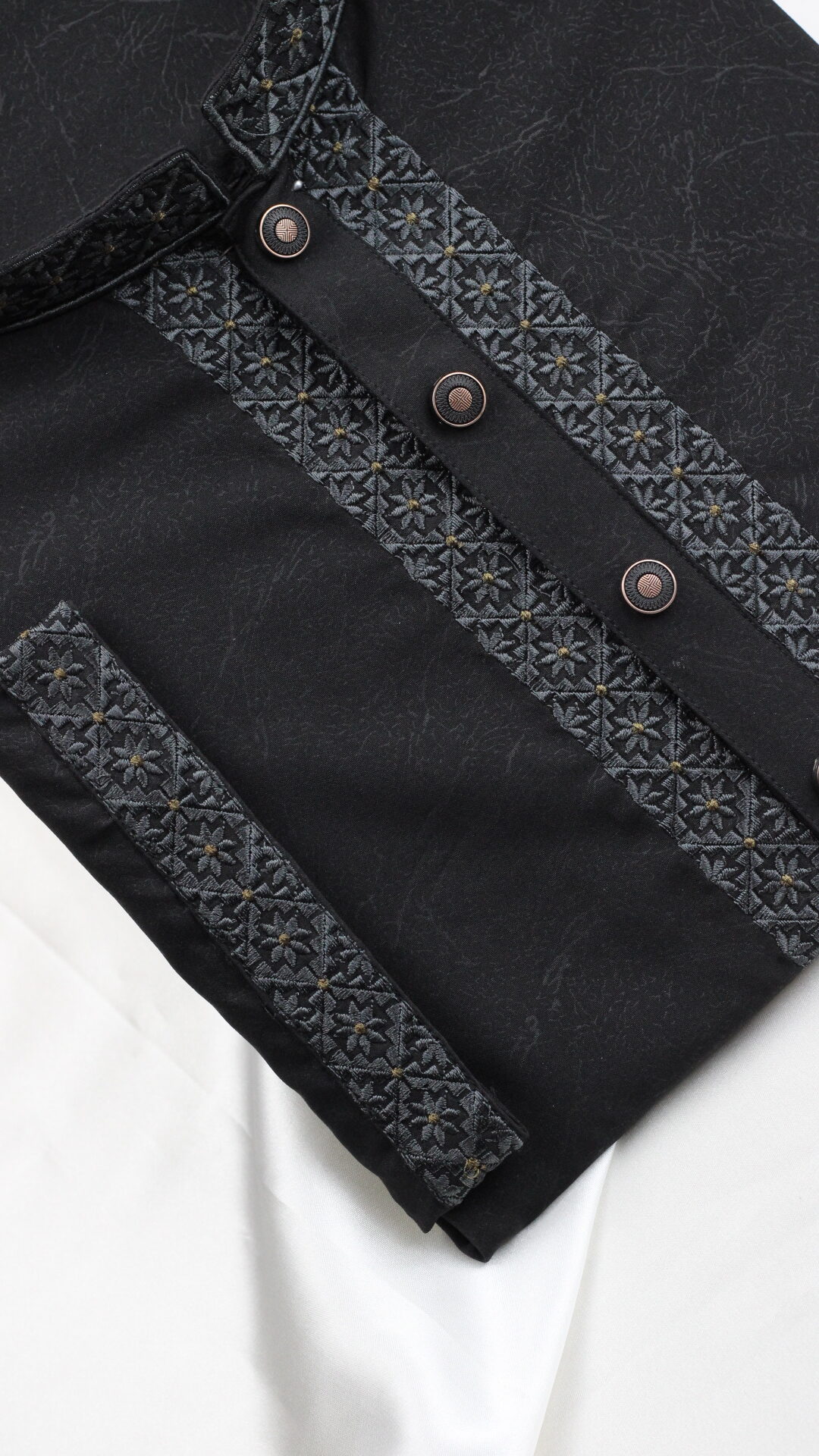 The material has a slight sheen and a very fine, smooth weave. Unlike the textured jacquard models, this fabric focuses on a clean, sleek appearance that highlights the detailed embroidery. The collar and chest panels feature high-density machine embroidery. The stitching is extremely precise, with no loose threads visible, indicating top-tier manufacturing quality.